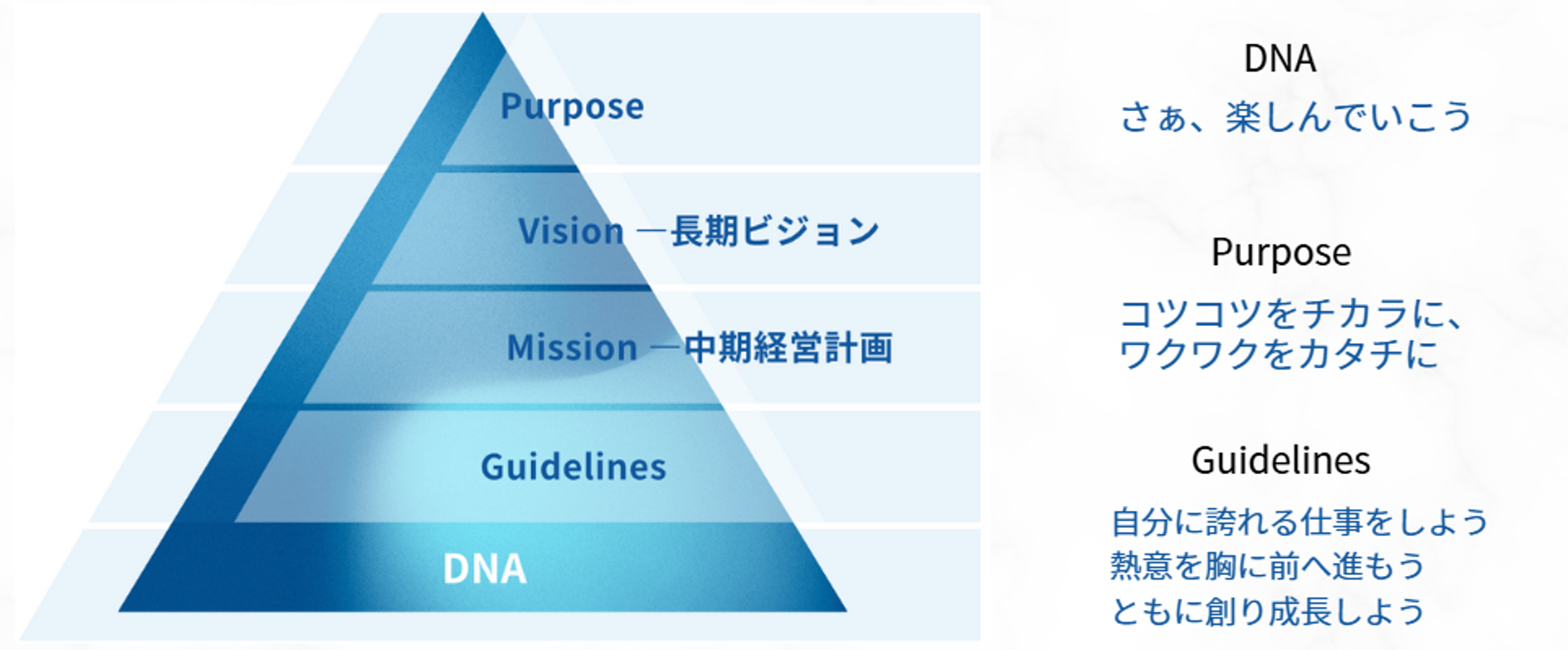 最初にあるのはDNAであるJQSの信念そのもの、「さぁ、楽しんでいこう」という言葉です。そのDNAをもった私たちの存在意義として、Purposeがあり、VisionやMissionがあり、それらを実現するためのGuidelinesがある。これが、これから私たちが大切にするJQS Wayのストーリーです。